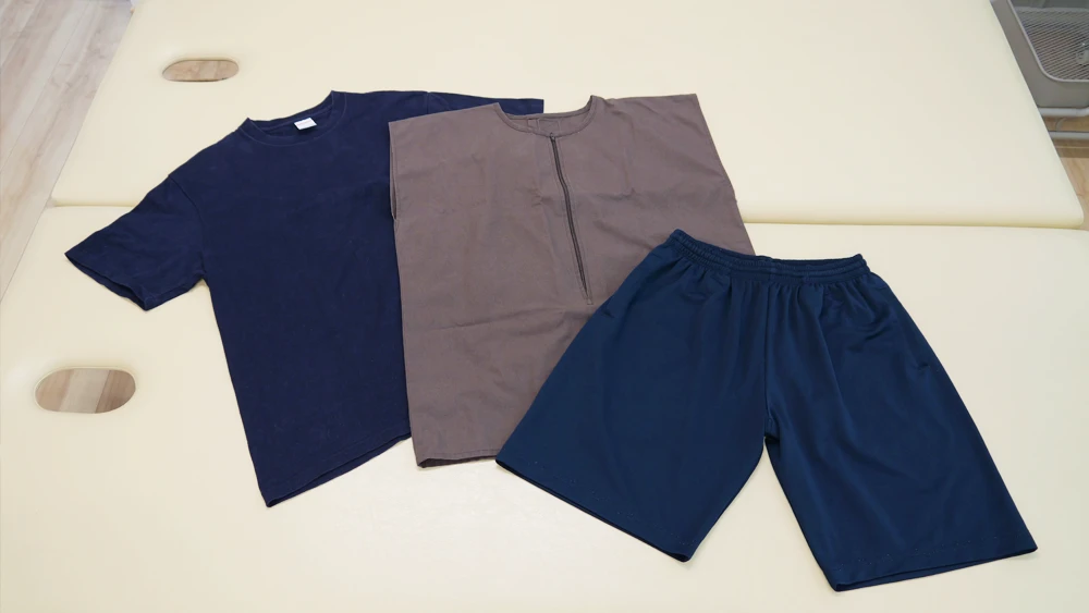 当院では、お着替えをご準備しておりますので服装はお気になさらずにお越しください。施術中の露出もできるだけ少なくすむようになっております。また、自分の着なれたものをお持ちいただいてもかまいません。